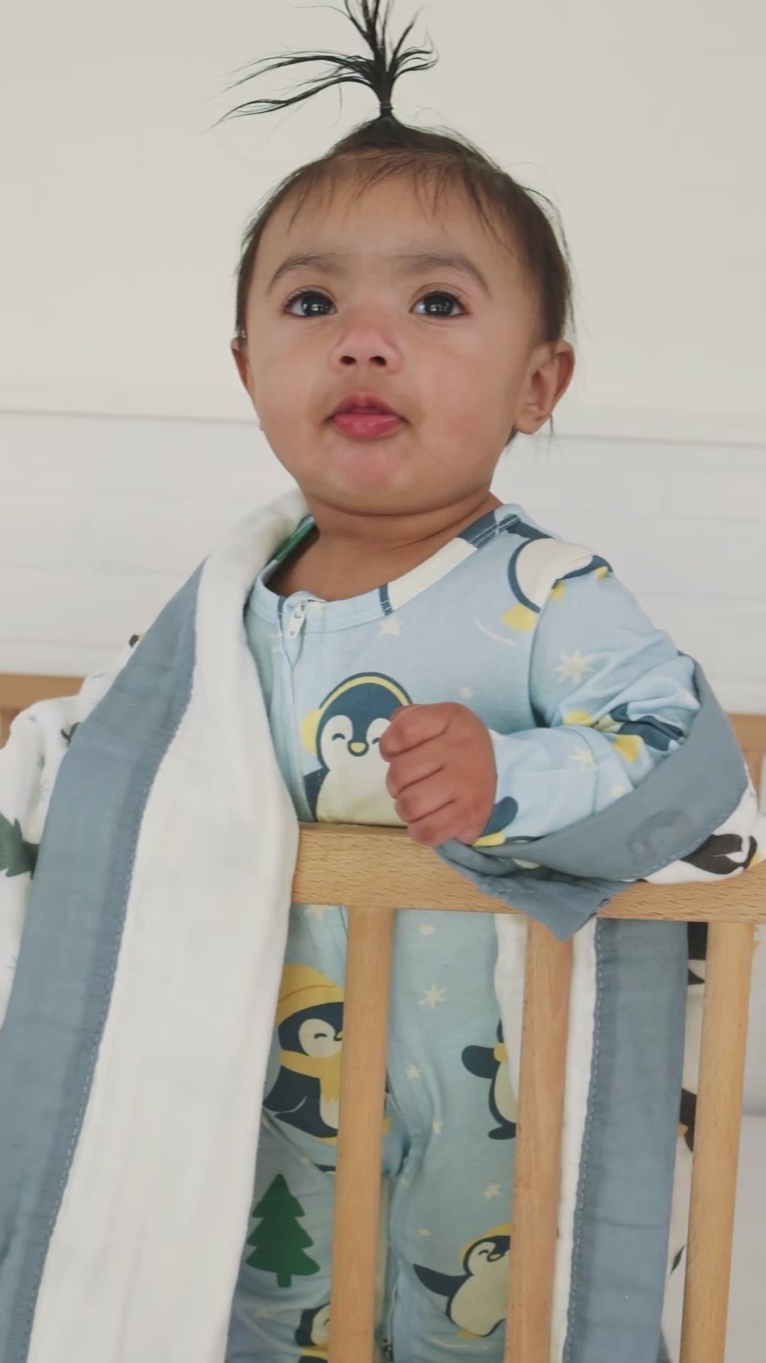 Cozy, cheerful, and made for the sweetest winter snuggles, our Winter Waddle baby blanket quilt is crafted from 100% muslin cotton to comfort your little one through chilly days and cozy nights. Thoughtfully designed for sensitive skin, this 6-layer quilt delivers breathable warmth from the newborn stage to toddlerhood — perfect for the holidays and beyond.